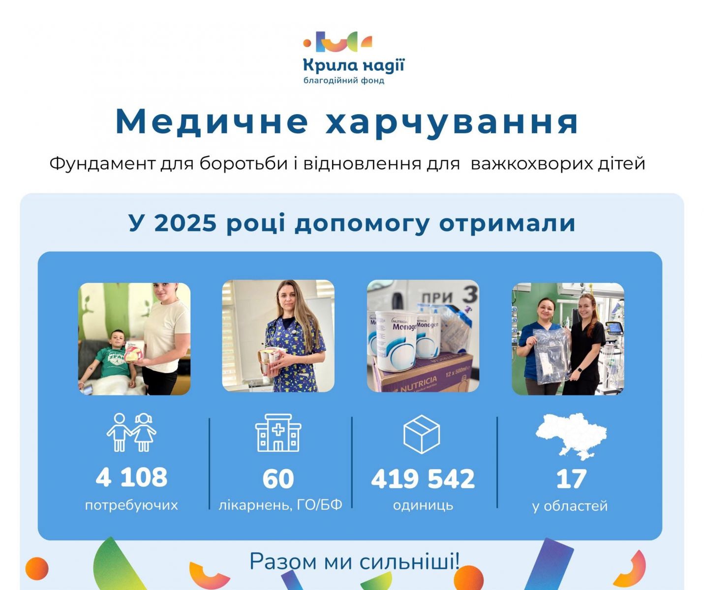 Завдяки підтримці наших партнерів Aide Médicale & Caritative France-Ukrainе Pallium for Ukraine Корпорація Монстрів Благодійна організація «Довіра нації» Мар'яна Рева Міжнародний благодійний фонд "Маленькі перемоги" та спільним зусиллям команди фонду і волонтерів, за цей рік ми мали змогу забезпечувати критичні потреби там, де зволікання коштує надто дорого.